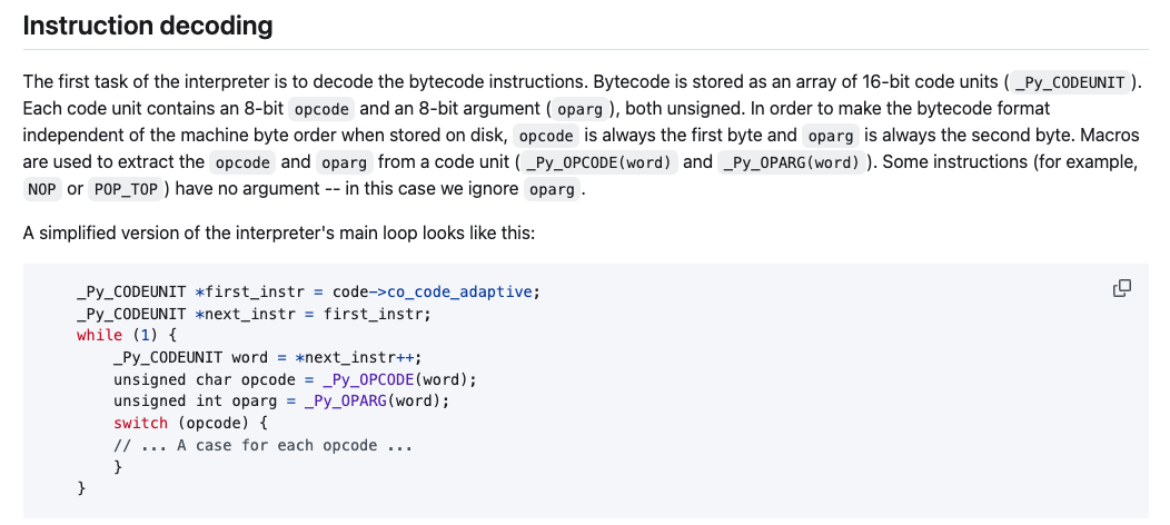 실제 파이썬 인터프리터가 어떻게 동작하는지 설명된 cpython의 md 파일의 일부이다