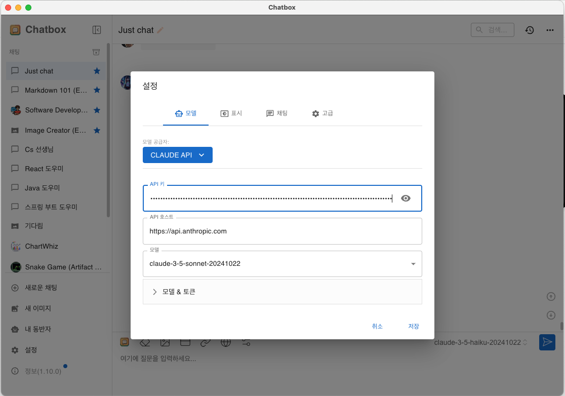 모델에서 CLAUDE API를 선택 후