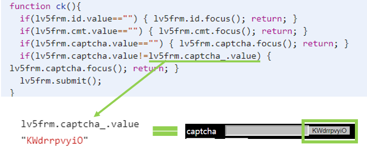 lv5frm.captcha.value값은 lv5frm.captcha_.value값과 같지 않을 때 return된다고 나타나져 있습니다.