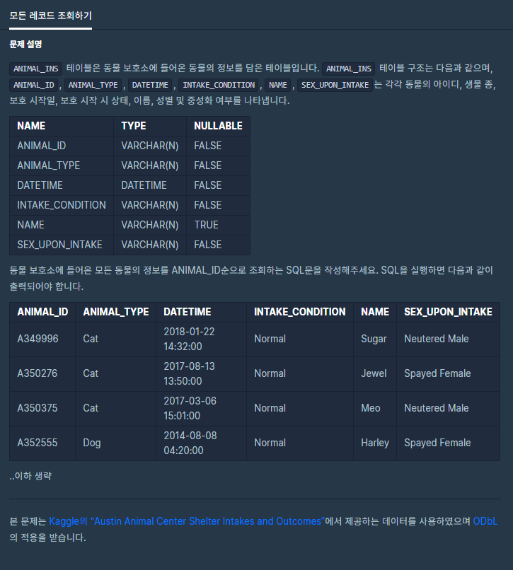 ANIMAL_INS 테이블은 동물 보호소에 들어온 동물의 정보를 담은 테이블입니다. ANIMAL_INS 테이블 구조는 다음과 같으며, ANIMAL_ID, ANIMAL_TYPE, DATETIME, INTAKE_CONDITION, NAME, SEX_UPON_INTAKE는 각각 동물의 아이디, 생물 종, 보호 시작일, 보호 시작 시 상태, 이름, 성별 및 중성화 여부를 나타냅니다.