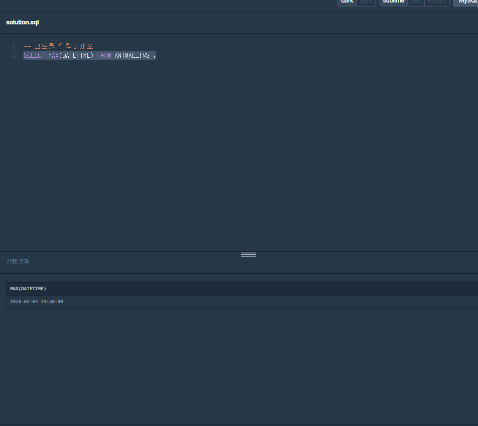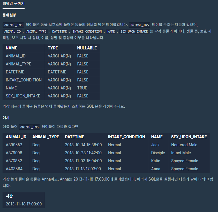 가장 최근에 들어온 동물이 들어온 시간을 구하는 SQL문을 작성해야 한다.