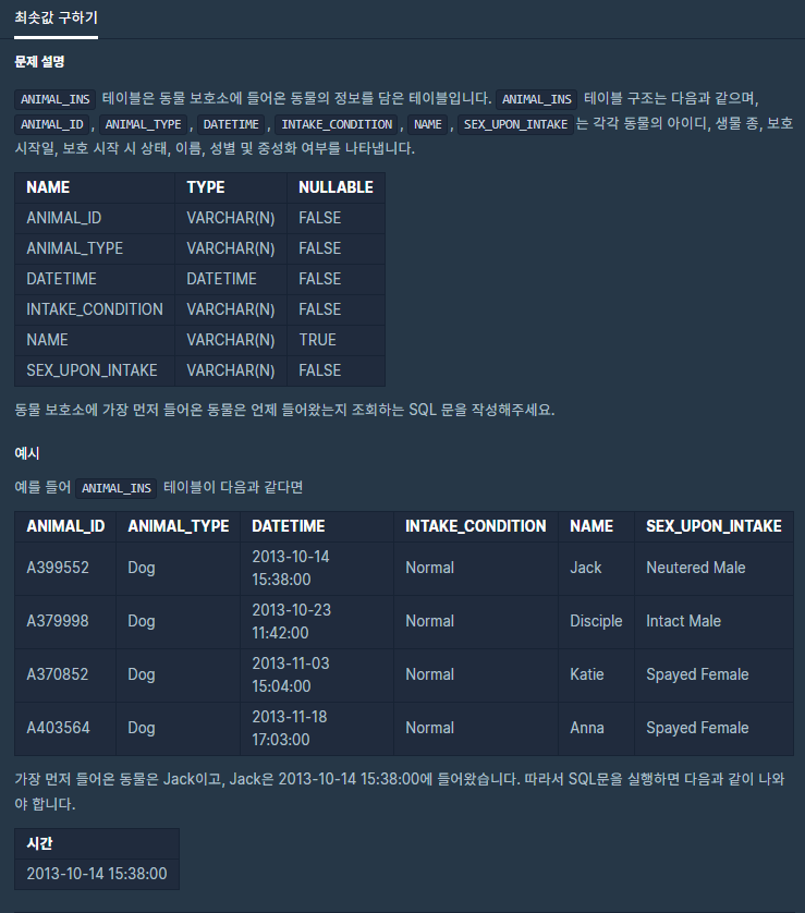 동물 보호소에 가장 먼저 들어온 동물은 언제 들어왔는지 조회하는 SQL 문을 작성해주세요.예시