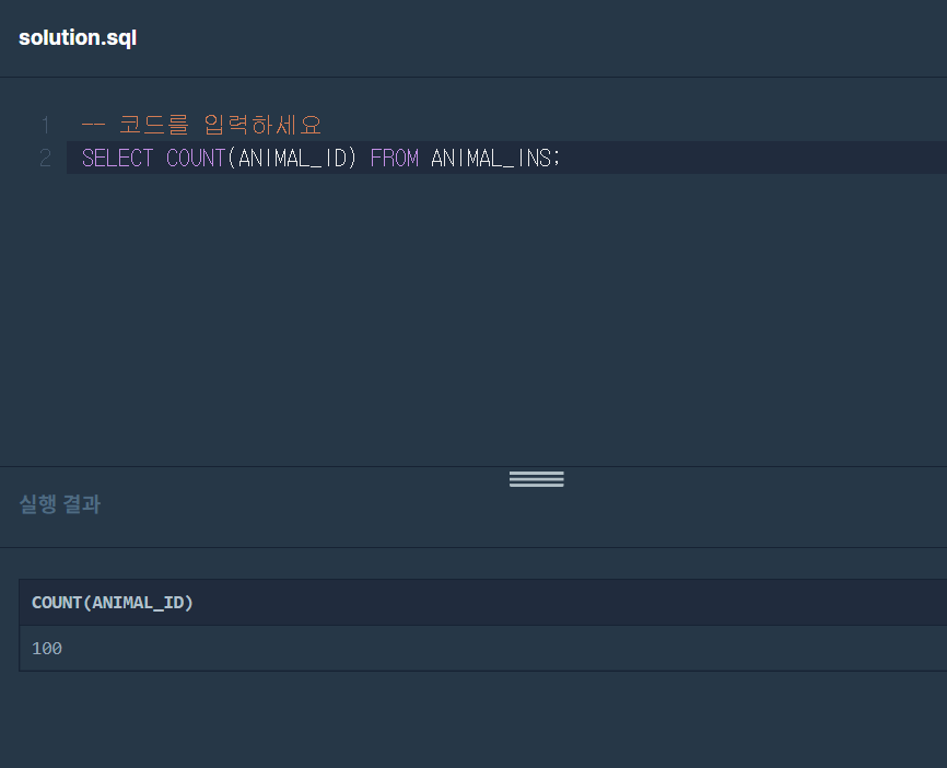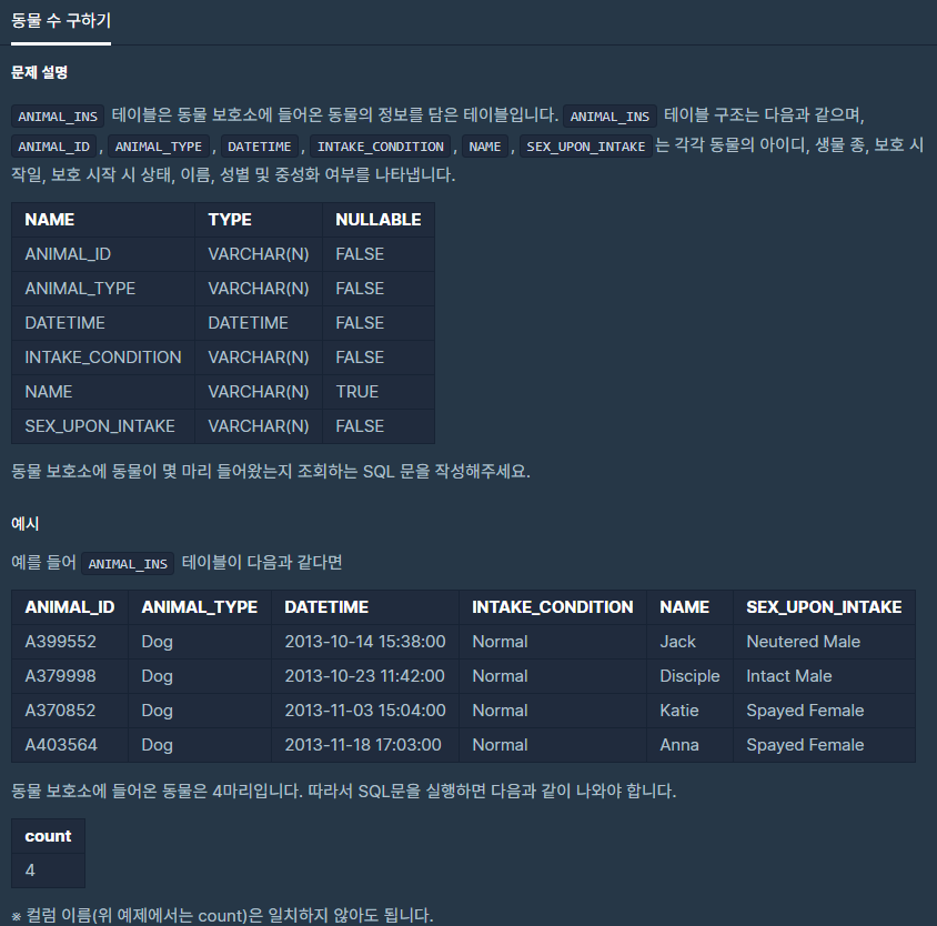 이 문제는 보호소에 들어온 동물의 수를 나타내는 SQL문을 작성해야 하는 것으로 보여진다.