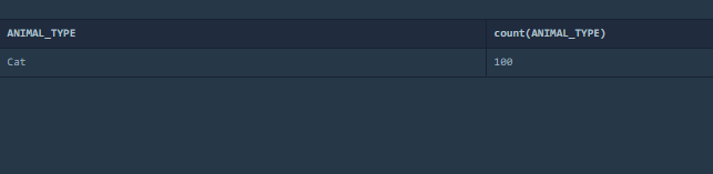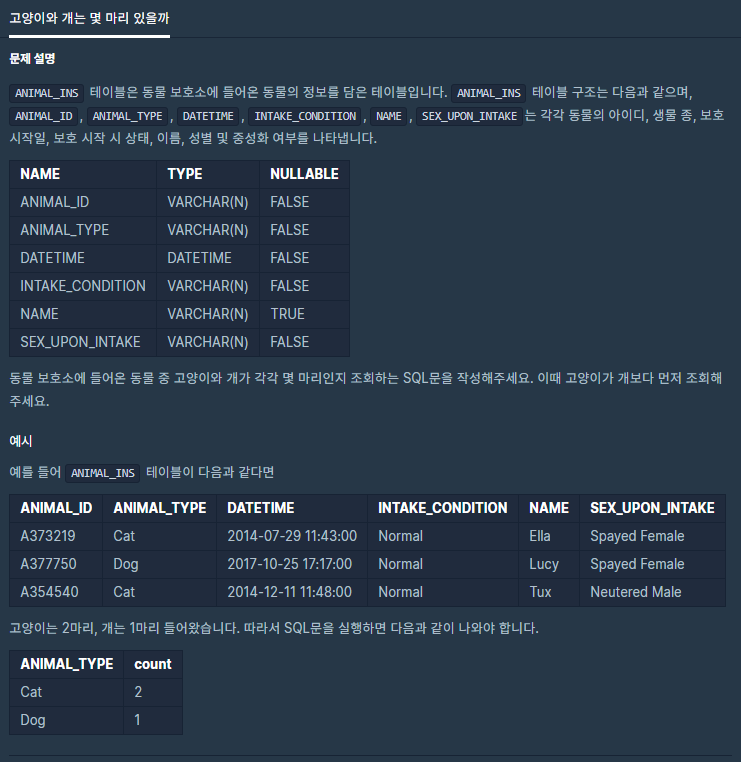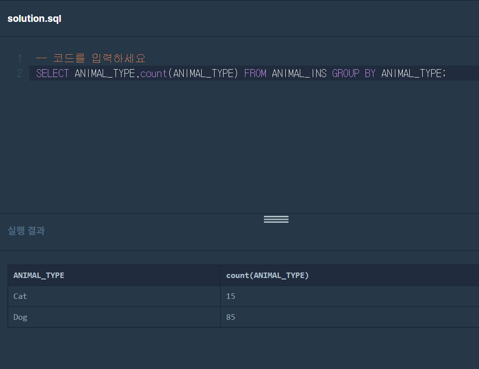 고양이는 2마리, 개는 1마리 들어왔습니다. 따라서 SQL문을 실행하면 다음과 같이 나와야 합니다.