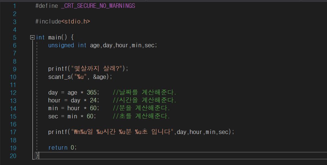 이 코드는 나이를 입력하면 그 나이입력 값을 바탕으로 날짜 시간 분 초를 계산해주는 프로그램이다.