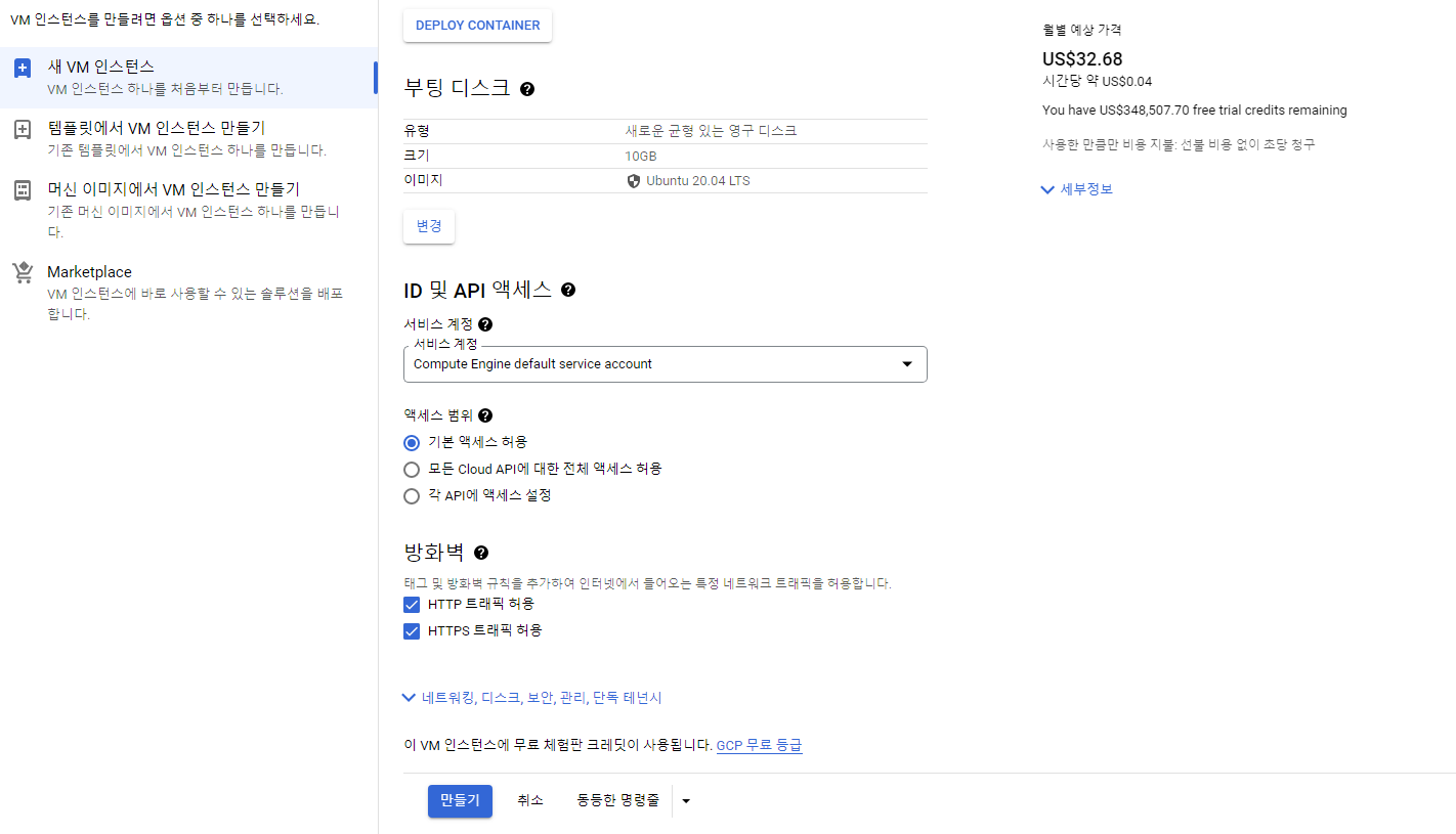 이 VM인스턴스에 무료 체험판 크레딧이 사용됩니다.라는 멘트가 적혀있는 것을 확인 한 뒤 만들기를 눌러주면