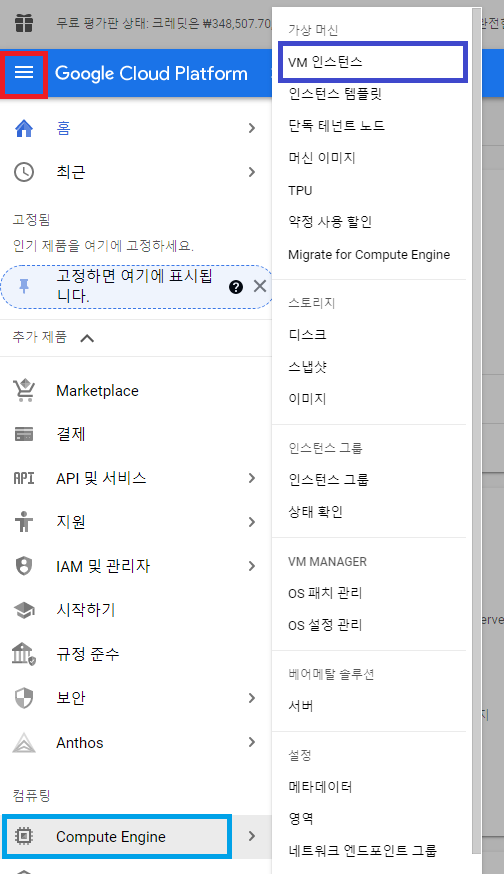 좌측 상단 메뉴 버튼을 누른뒤 -> Compute Engine -> VM인스턴스를 누르면