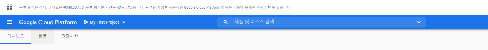 잘 안 보이지만 무료 평가판 크레딧이 있다는 알림이 위에 적혀있음을 확인한 뒤