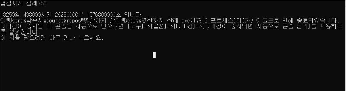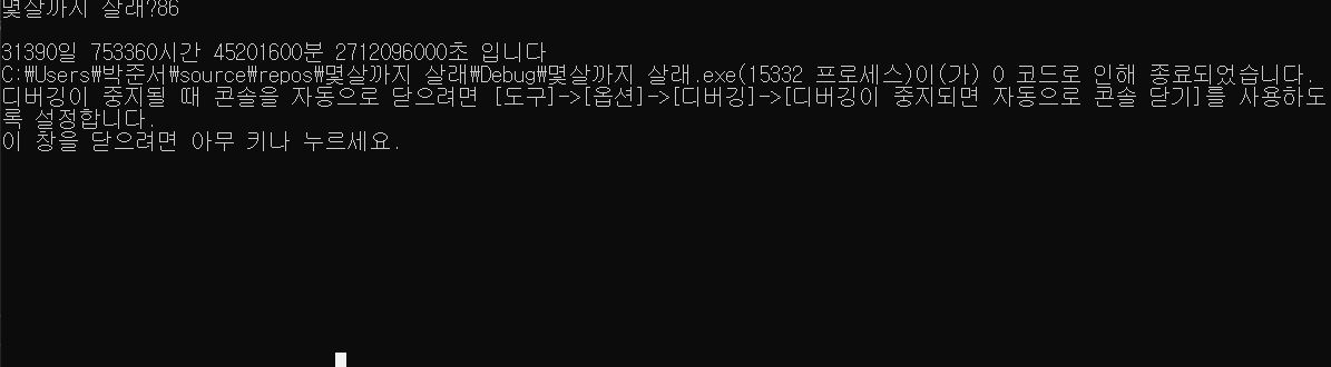 이 코드는 나이를 입력하면 그 나이입력 값을 바탕으로 날짜 시간 분 초를 계산해주는 프로그램이다.